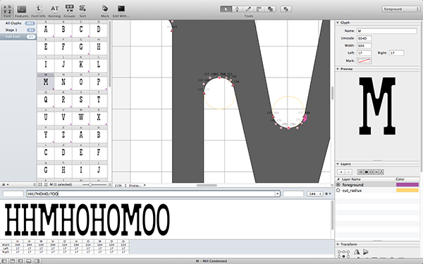 I wanted to create a typeface that sat between traditional type and contemporary media. It is styled it after classic American wood type with condensed proportions and fatter serifs. While doing the initial sketches and brainstorming for this typeface, I knew I wanted to cut the typeface using a single bit on a CNC mill. Rather than hand finish the corners with a chisel, or use a V carve bit, using a single round bit really puts the process on display. This added a couple constraints to my type. For one, all the inside corners needed the same radius. I had to do away with any sharp inside corners and bend some of the legibility and weight rules to fit to this physical constraint. I designed the typeface in Robofont so I have a working font file as well as the finished cut wood type.
