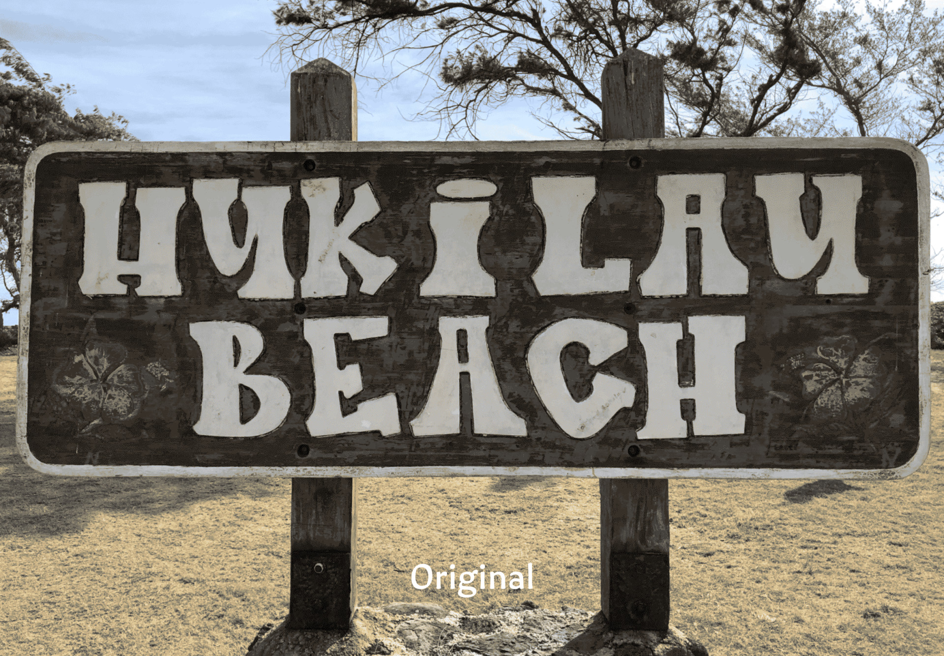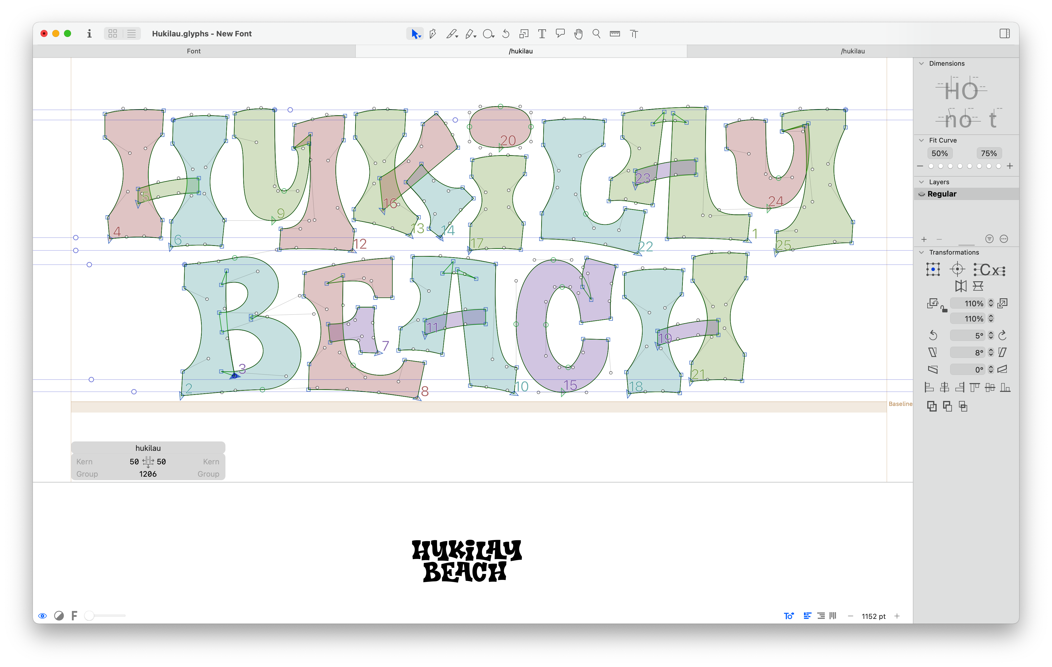 I find it's easier and quicker to sketch out these shifts. This way I can explore a few varieties and shapes quickly without just tweaking verctor paths back and forth. Letters at their core are hand-made marks, the best way to keep life in the letters and find a natural shape are to explore them by hand. Taking this sign into sketch form, I really worked out how to stretch and interlock some of the letters to help with the spacing and take advantage of that bouncing form. I am rather fond of the way the leg in the k fits into the i and the last u in Hukilau is propped up on the foot of the A.