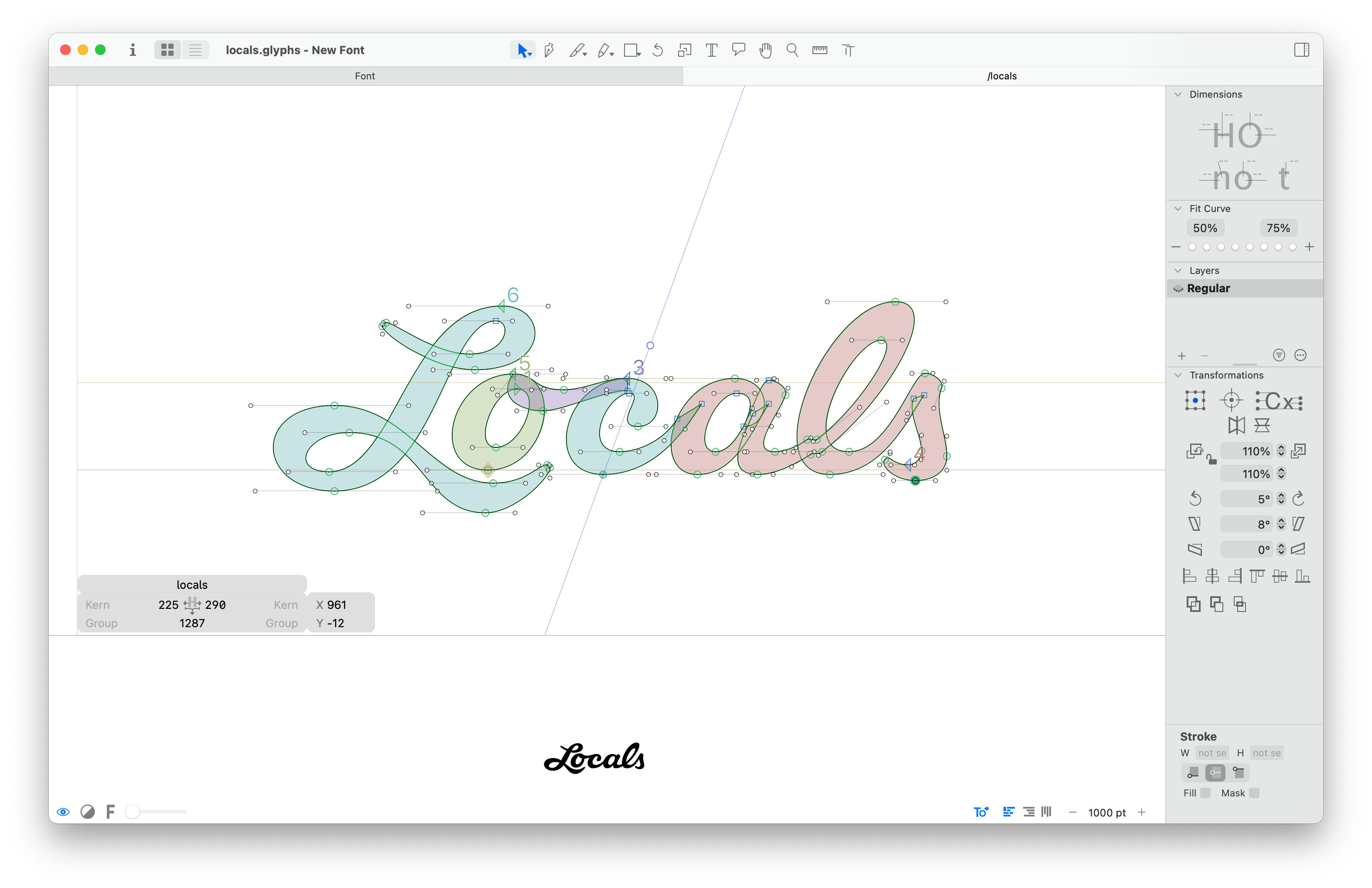 Once I'm happy with the forms I can take it into vector form and give it another once over. At this point its more than just tracing what I've drawn, but really looking at the shapes and making sure this are a consistent weight with some nice curves. One little tidbit that I find interesting is the crossover on the lowercase l. If that line literally crossed straight across it appears to shoot out a little too high. It's called the Poggendorff illusion and it's an easy fix once you know what to look for.